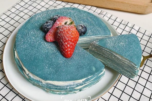 Phần vỏ bánh ngàn lớp: 8g hoa đậu biếc, 330ml sữa, 3 quả trứng gà, 80g bột bánh bông lan, 15g bột ngô, 20g bơ, 30g đường, 1g muối.