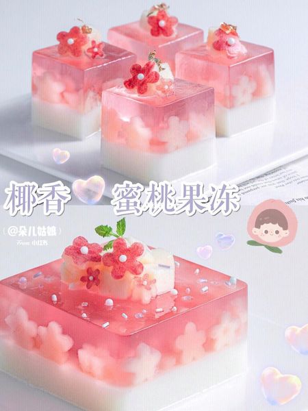 🥥 Thạch đào sữa dừa: 100ml nước cốt dừa, 25g đường, một ít bột gelatin, 1 lượng nước đào vừa phải.
