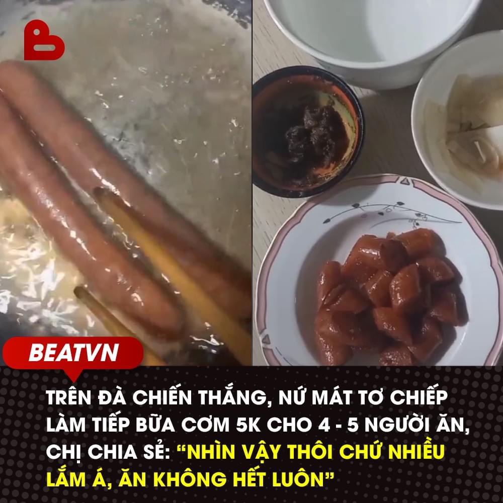 Tới hôm nay, để khẳng định sự đa tài của bản thân, chị tiếp tục cho ra sản phẩm 5k/1 bữa cơm 5 người. Chị mua 2 chiếc lạp xưởng với giá 2k/cây, luộc xong đem đi xào với chút dầu ăn là có thể ăn ngon lành. Mâm cơm 5k gồm có 1 đĩa lạp xưởng, 1 bát mắm tôm, 1 bát măng ngâm và đặc biệt, 1 bát ô tô nước lọc để chan cùng cơm.