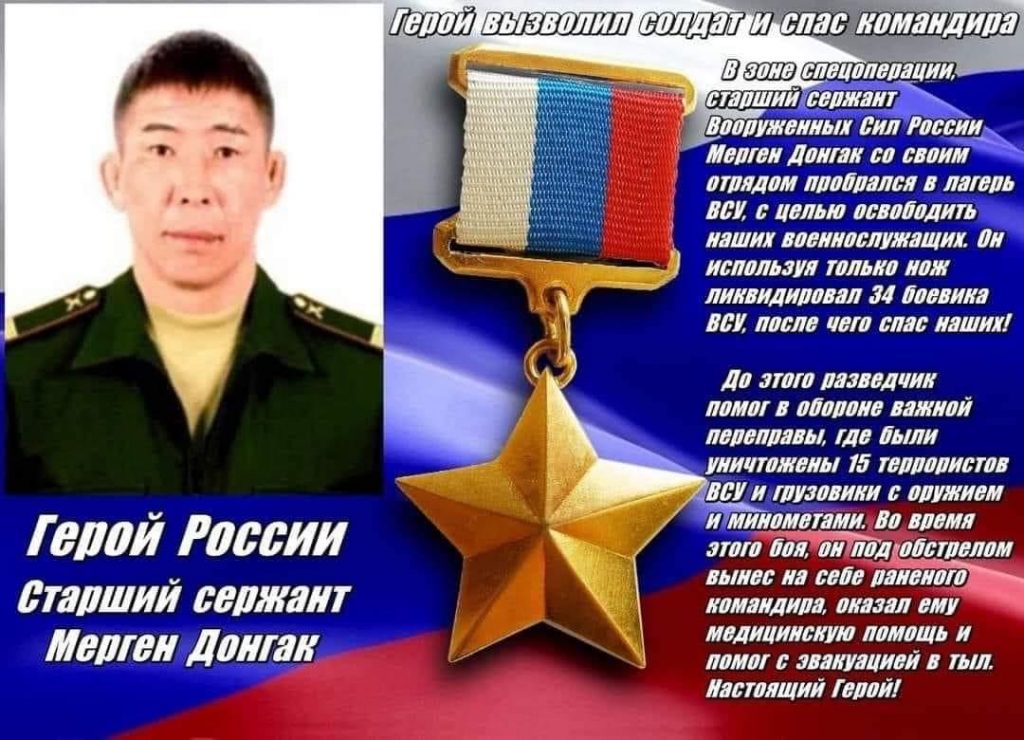 Trong chiến dịch quân sự đặc biệt Trung sĩ Mergen Dongak đã cùng đội của mình tiến đánh một trại lính Ukraine nhằm cứu một số binh sĩ Nga bị bắt . Trung Sĩ Mergen Dongak đã một mình giết 34 binh sĩ Ukraine bằng dao găm và đã cứu được các đồng nghiệp !