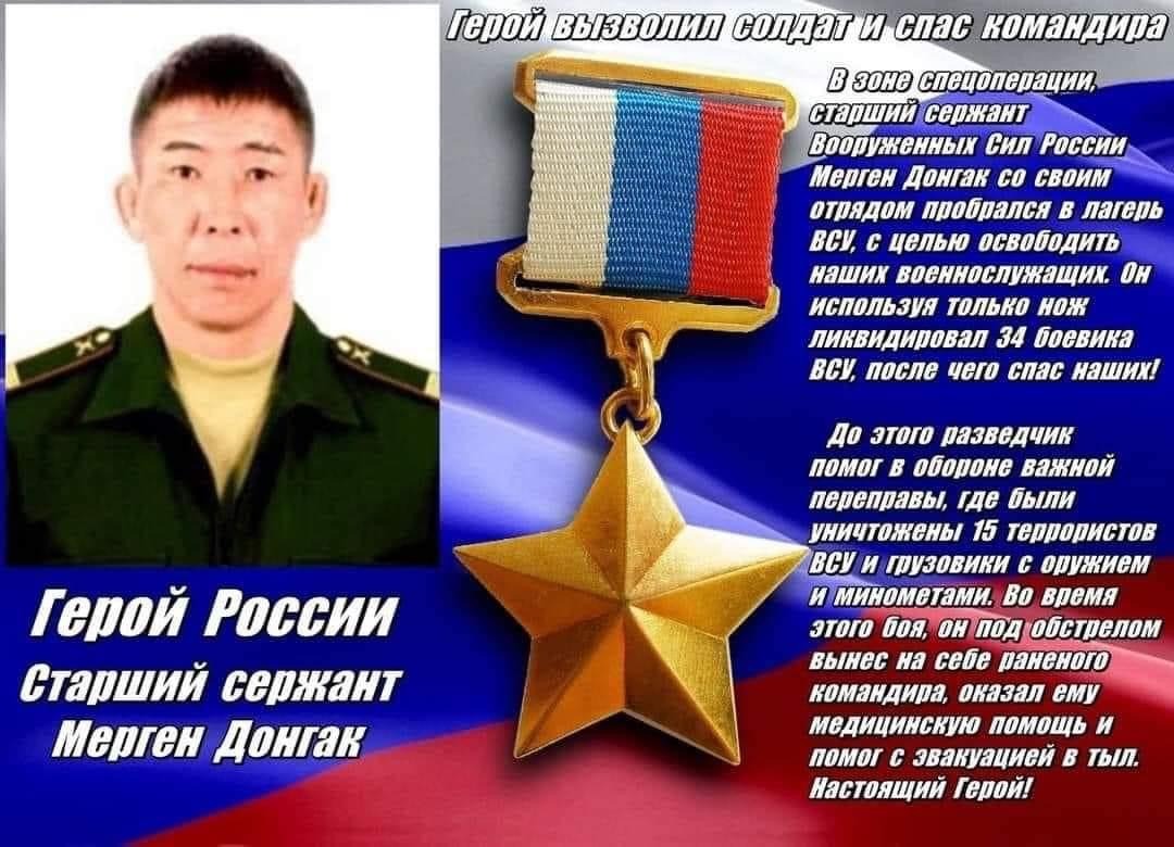 Trong chiến dịch quân sự đặc biệt Trung sĩ Mergen Dongak đã cùng đội của mình tiến đánh một trại lính Ukraine nhằm cứu một số binh sĩ Nga bị bắt . Trung Sĩ Mergen Dongak đã một mình giết 34 binh sĩ Ukraine bằng dao găm và đã cứu được các đồng nghiệp !