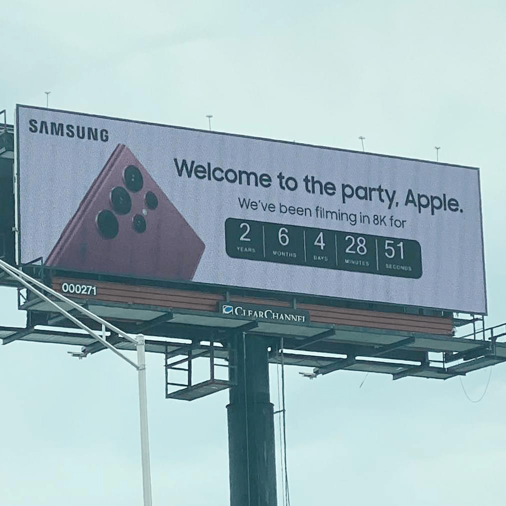 Quả không làm người xem phải thất vọng, Samsung – đối thủ truyền kiếp của Apple đã nhanh chóng lên sóng Billboard quảng cáo “cà khịa” nhà Táo với thông điệp đầy xéo xắt: “Chào mừng Apple đã nhập hội Smartphone quay phim 8K nhé. Còn chúng tôi thì đã làm điều đó được 2 năm 6 tháng 4 ngày 28 phút 51 giây rồi cơ”. Điểm đặc biệt ở chỗ Samsung sử dụng màn hình quảng cáo kỹ thuật số để hiển thị đồng hồ đếm giờ tăng dần theo thời gian.