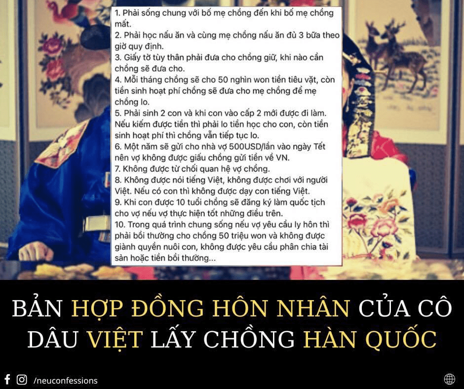 Không được nói và dạy con nói tiếng Việt, phải phục vụ mẹ chồng, phải đẻ 2 con, mất hết quyền tự do…. Hợp đồng hôn nhân kiểu này tưởng chừng chỉ tồn tại trong …
