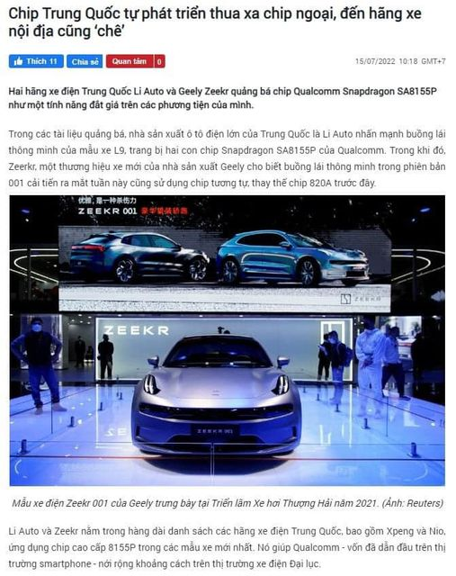 Chip Trung Quốc tự phát triển thua xa chip ngoại, đến hãng xe nội địa cũng ‘chê’. Hai hãng xe điện Trung Quốc Li Auto và Geely Zeekr quảng bá chip Qualcomm Snapdragon SA8155P như …