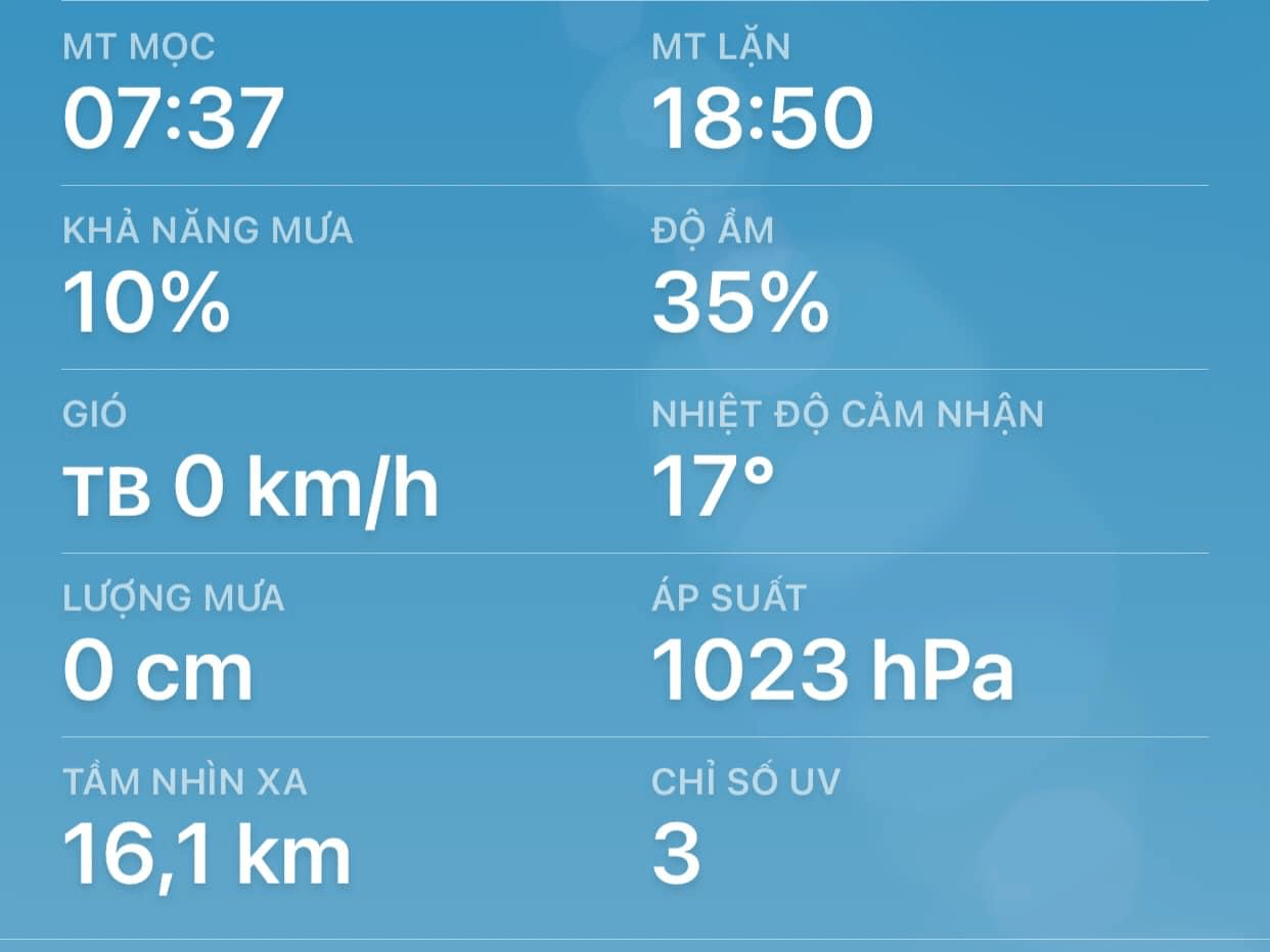 Trời luôn luôn nắng mặc dù nhiệt độ thấp, độ ẩm hiển thị chỉ dưới 50%, tầm nhìn xa do trời quang mây