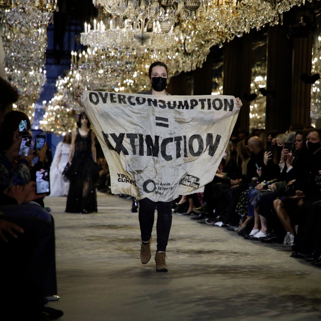 Các nhà hoạt động về khí hậu đã xuất hiện trên sàn catwalk tại Tuần lễ thời trang Paris của Louis Vuitton vào ngày 4/10 vừa rồi để cảnh báo tác động của ngành thời trang đối với môi trường, với biểu ngữ lên án sự ảnh hưởng của việc tiêu thụ quá mức.