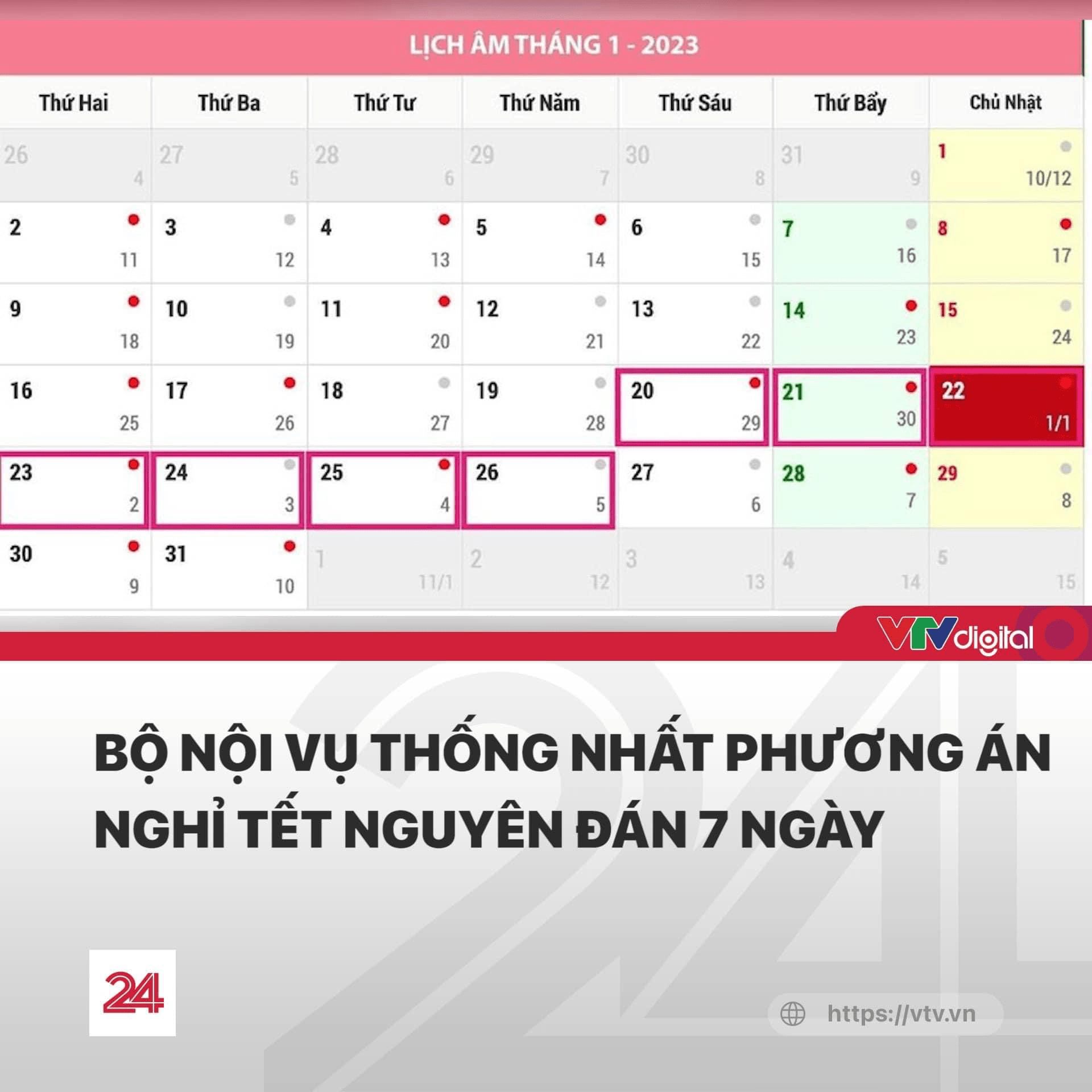 Theo đó, công chức, viên chức nghỉ Tết Nguyên đán 2023 từ thứ Sáu ngày 20/1/2023 Dương lịch đến hết thứ Năm ngày 26/1/2023 Dương lịch (tức ngày 29 tháng chạp năm Nhâm Dần đến hết ngày mùng 5 tháng giêng năm Quý Mão).