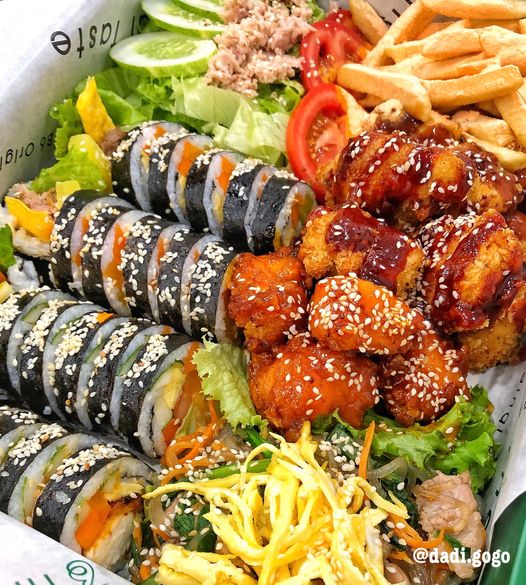 Mình gọi Box đồ Hàn số 3 (300k) khá nhiều món với 4 loại kimbap: kimbap bò bulgogi, kimbap cá ngừ, kimbap gà giòn cay, kimbap phô mai, gà cay HQ, Gà thảo mộc, miến trộn, salad cá ngừ, nugget sốt BBQ 😍