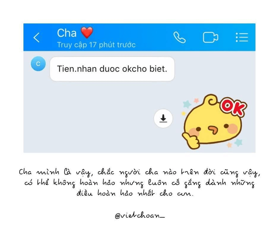 Cha mình là người luôn vét hết tiền trong túi cho con. Cấp 3 hai anh em mình ở trọ cho gần trường. Cuối tuần mình không về thì cha mẹ chạy ra. Mỗi lần ra đều cho tiền và rất nhiều đồ ăn. Mình vẫn nhớ như in lần đó cha đem ra 5 trái chanh, 3 tép xả, 3 trái cà chua, 2 trái bí đao, 2 trái cà tím, 2 trái bắp luộc, nửa trái bí đỏ, 1 bịch ớt hiểm và cho mình 3 triệu 1 trăm 23 nghìn.