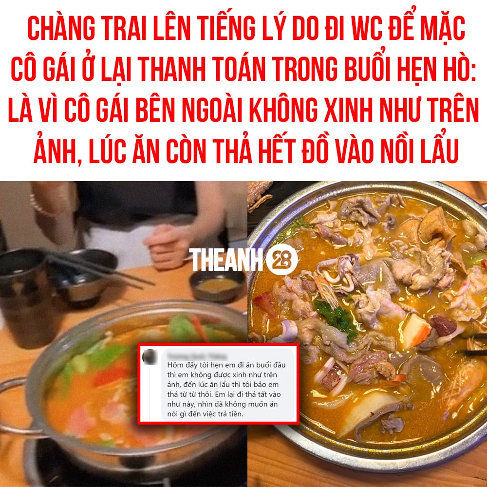 Lý do đầu tiên mà anh zai chia sẻ là bạn nữ đấy bên ngoài không xinh như trên ảnh, cảm giác hụt hẫng đi rất nhiều so với kỳ vọng của anh lúc hẹn gặp. Chưa hết, lúc ngồi ăn thì cô gái thả hết mồi vào nồi lẩu dù đã được anh zai nhắc nhở là thả từ từ thôi, trông chẳng khác nào cái nồi cám ***, làm chàng trai ăn mất ngon nên không còn tâm trạng muốn thanh toán.