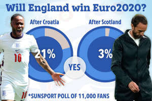 Trong khi đó, theo cuộc thăm dò của tờ The Sun (Anh), sau trận thắng Croatia 1-0 ở ngày ra quân Euro 2020 thì đội tuyển Anh được kỳ vọng rất cao. Trong tổng số 11.000 người được hỏi ý, có 21% dự đoán tuyển Anh vô địch, 12% khác dự báo vào chung kết, 22% chọn vào bán kết và chỉ có 6% nghĩ tuyển Anh sẽ rơi đài từ vòng bảng.