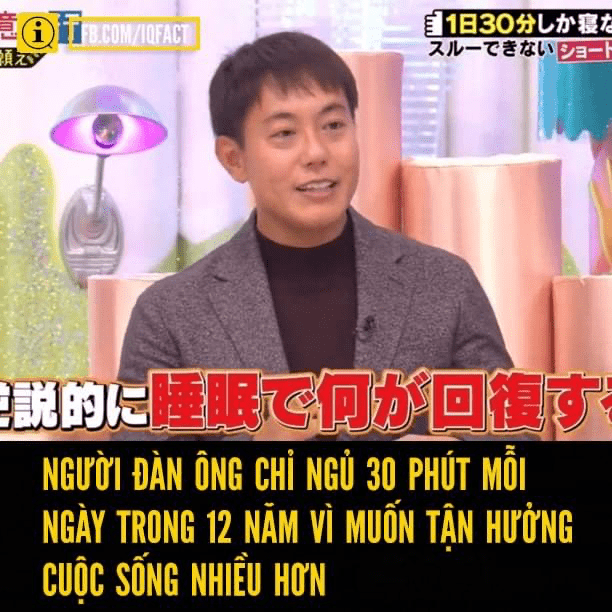 Đây là câu chuyện của Daisuke Hori, một người đàn ông 36 tuổi đến từ Nhật Bản. Anh khẳng định mình chỉ ngủ 30 phút mỗi ngày và không thấy mệt mỏi gì. Daisuke cho rằng ngủ càng ít thì càng giúp trí óc tỉnh táo, càng có nhiều thời gian vui chơi, làm việc.