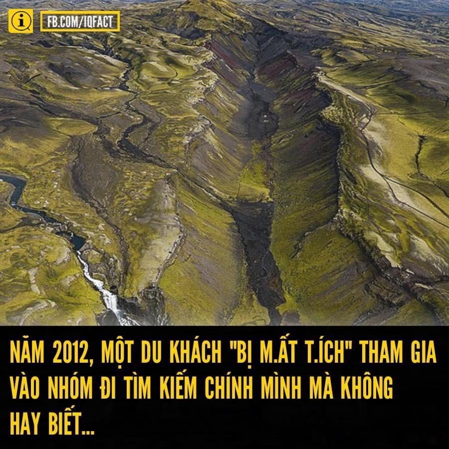 Sự cố hy hữu xảy ra ở hẻm núi lửa Eldgja, Iceland vào năm 2012. Đoàn khách du lịch đang đi thì bỗng nhiên phát hiện một thành viên biến mất trong lúc xe dừng gần hẻm núi. Thực tế, nữ du khách mất tích chỉ đi thay quần áo rồi quay lại xe ngay nhưng mọi người không để ý.