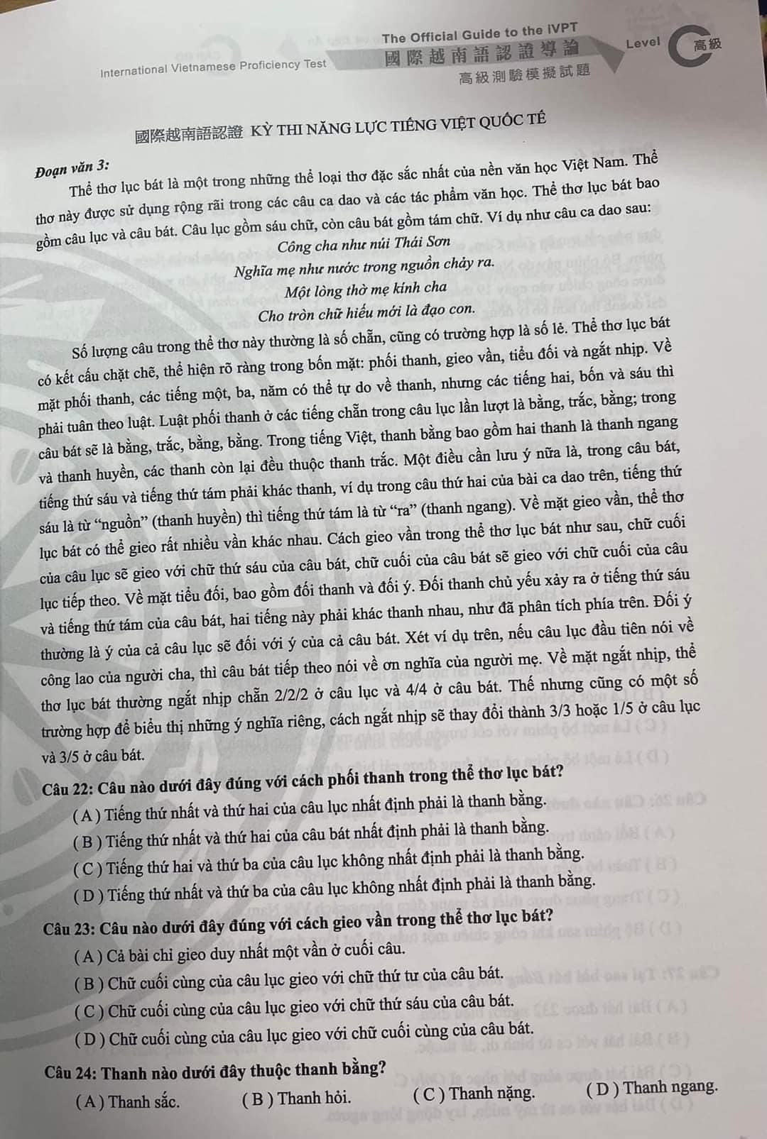 Những ngày gần đây, một bài thi tiếng Việt trong kỳ thi năng lực tiếng Việt Quốc tế đã làm nhiều người xôn xao “mắt chữ O, miệng chữ A” khi thấy đề thi làm khó học viên. Đến cả người Việt đọc vào đề thi cũng hoang mang và tự đặt câu hỏi: “Liệu rằng mình đã hiểu hết tiếng mẹ đẻ, hiểu được hết quy luật của thơ Lục bát”?.