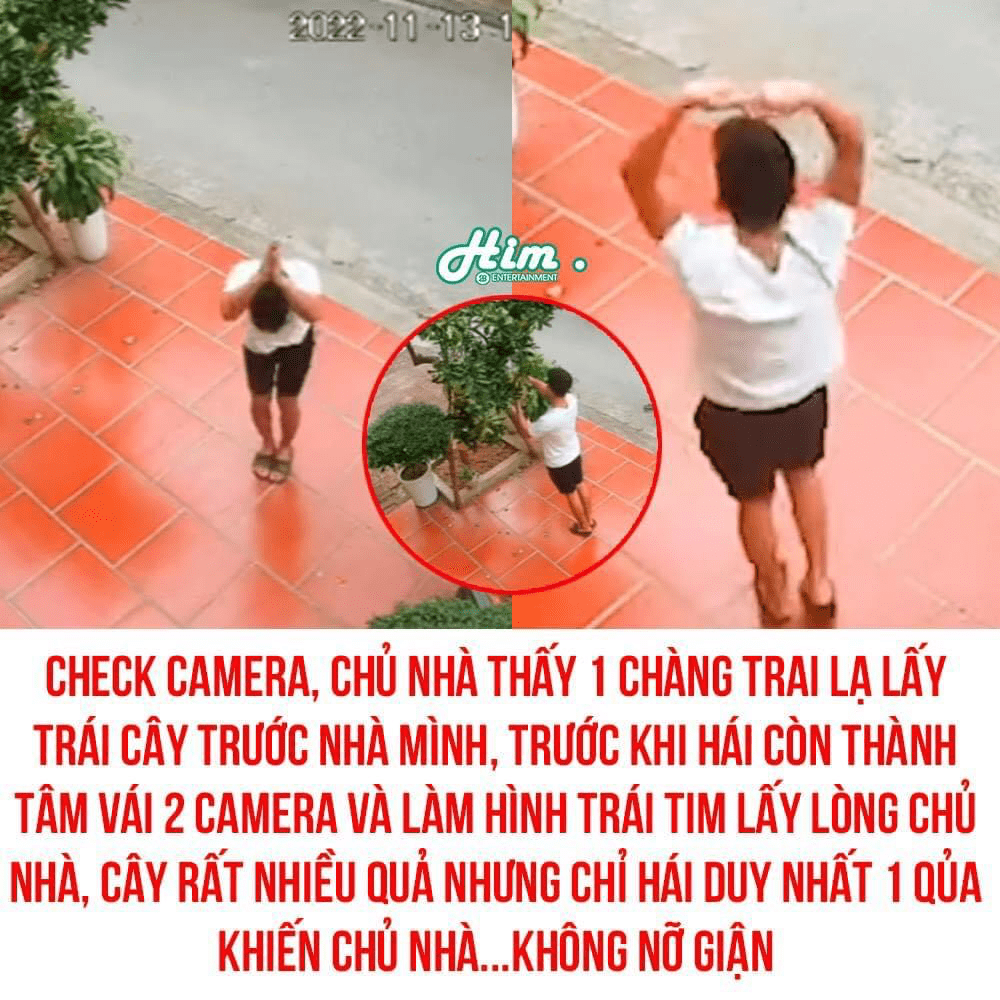 Nhưng không lấy ngay, chàng trai đã thành tâm vái lạy 2 camera ở trước cửa nhà, sau đó còn lấy 2 tay làm hình trái tim xoáy vài vòng trước camera như ra hiệu ‘cháu xin rồi đấy nhá’, sau đó mới ra chỗ cái cây.
