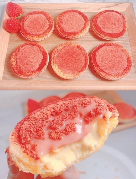 Trong khi đợi bánh nướng xong, ta sẽ đun chảy socola trắng bằng nồi cách thủy, cho thêm một lượng bột dâu tây vừa đủ để tạo màu hồng, sau đó cho tiếp 50ml kem tươi vào khuấy đều.