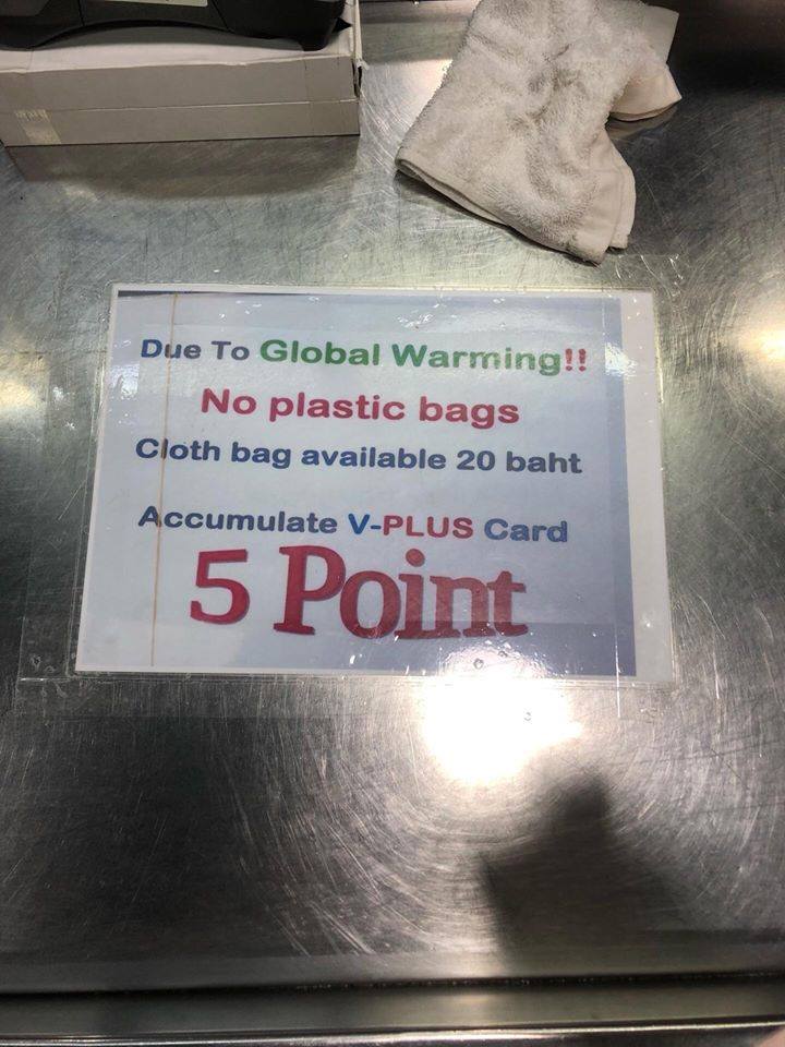 “ Để hạn chế sự nóng lên toàn cầu, hãy ngưng sử dụng túi nilon . Túi vải được bán ở đây với giá chỉ 20 bath. Khi mua túi bạn sẽ tích thêm 5 điểm vào thẻ V-Plus.”