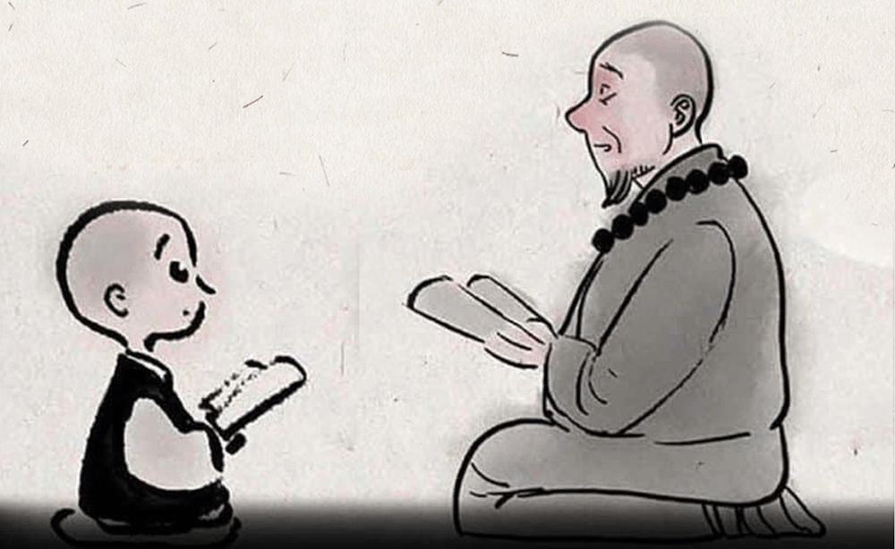 Chuyện kể rằng, tại một ngôi chùa trên núi, có một vị sư phụ đều thức dậy sớm ngồi vào bàn để đọc sách – dù những cuốn sách này đã cũ kỹ. Tiểu hòa thượng bên cạnh sư phụ thấy vậy, cũng cố gắng bắt chước sư phụ mình đọc sách.