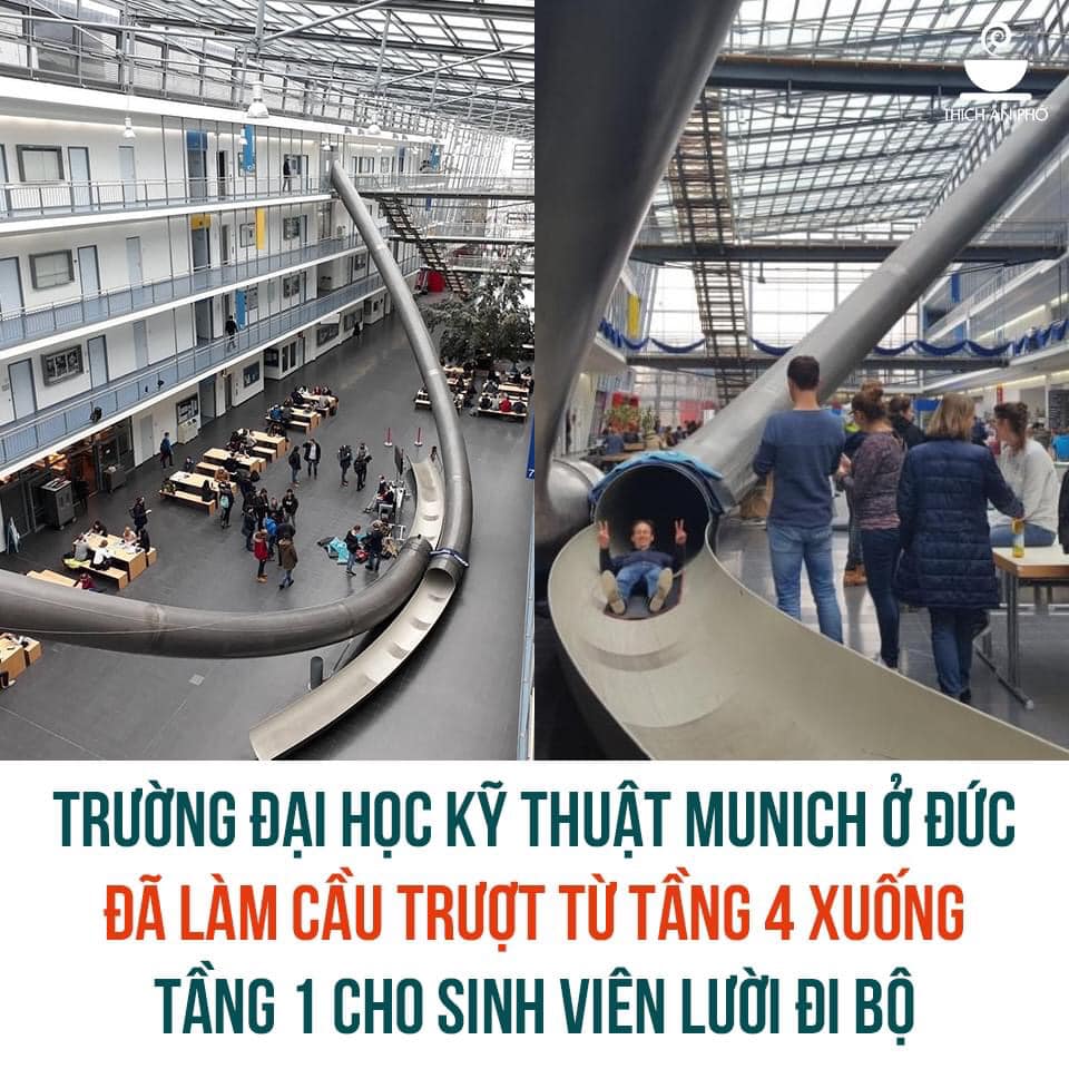 Chiếc ống trượt hình Parabol chạy từ tầng 4 xuống tầng 1 được cho là sáng tạo thú vị mang đến sự độc đáo trong kiến trúc và sự thuận tiện cho sinh viên