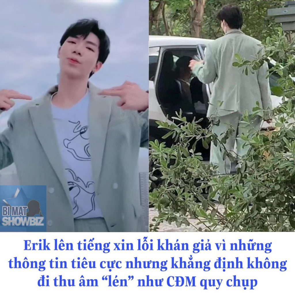 – Vào lúc 13h ngày (1/9/2021), Erik có nhận được lịch trình đi thu âm và ghi hình ca khúc chống dịch “Hoan hô chiến sỹ tuyến đầu” cho chương trình được chiếu trên kênh VTV3 tại Studio ở quận 1 (Erik có đính kèm hình ảnh thư mời ở phía dưới). Dự án cộng đồng có sự tham gia của các nghệ sỹ trong chương trình và Erik là nghệ sỹ đầu tiên có lịch thu. Buổi thu âm hôm qua được tổ chức bởi ekip của công ty Cát Tiên Sa – đơn vị sản xuất chương trình. Buổi quay đã được ekip của Cát Tiên Sa sắp xếp thực hiện đủ và đúng các quy tắc phòng chống dịch trước khi thu âm (có cơ sở y tế xuống tận nơi để xét nghiệm và cho ra kết quả âm tính, đo thân nhiệt, khử khuẩn đầy đủ trước khi ra về,…) Vì vậy, chuyện “lén” đi thu âm và ekip “quá chục người” (các nhân viên y tế đã ra về ngay khi hoàn thành các thủ tục đảm bảo an toàn) như một số thông tin đăng tải trên mạng là hoàn toàn không chính xác.