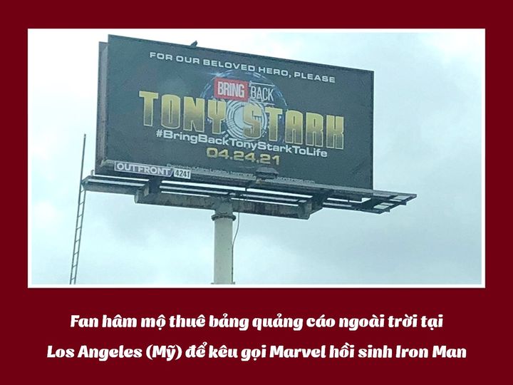 Hình ảnh một bảng quảng cáo ngoài trời cỡ đại với nội dung: “Hãy mang Tony Stark trở lại” được chia sẻ tràn lan trên mạng xã hội Twitter. Theo Variety, bảng quảng cáo này được đặt tại thành phố Los Angeles, Mỹ và do một nhóm người hâm mộ Marvel tự bỏ tiền để dựng nên. Mục đích của họ là bày tỏ sự yêu mến với Iron Man và yêu cầu Marvel hồi sinh nhân vật này trong tương lai gần. Trùng hợp hơn, công cuộc đòi Tony Stark hồi sinh diễn ra đúng 2 năm kể từ ngày bom tấn Avengers: Endgame ra mắt tại Mỹ. Bài đăng về bảng quảng cáo này cùng hashtag #BringbackTonyStarkToLife đang được rất nhiều người hưởng ứng.