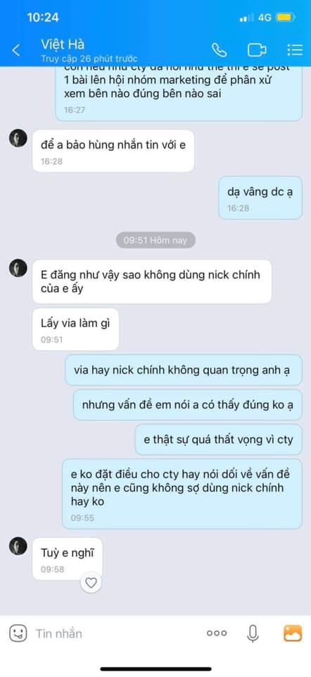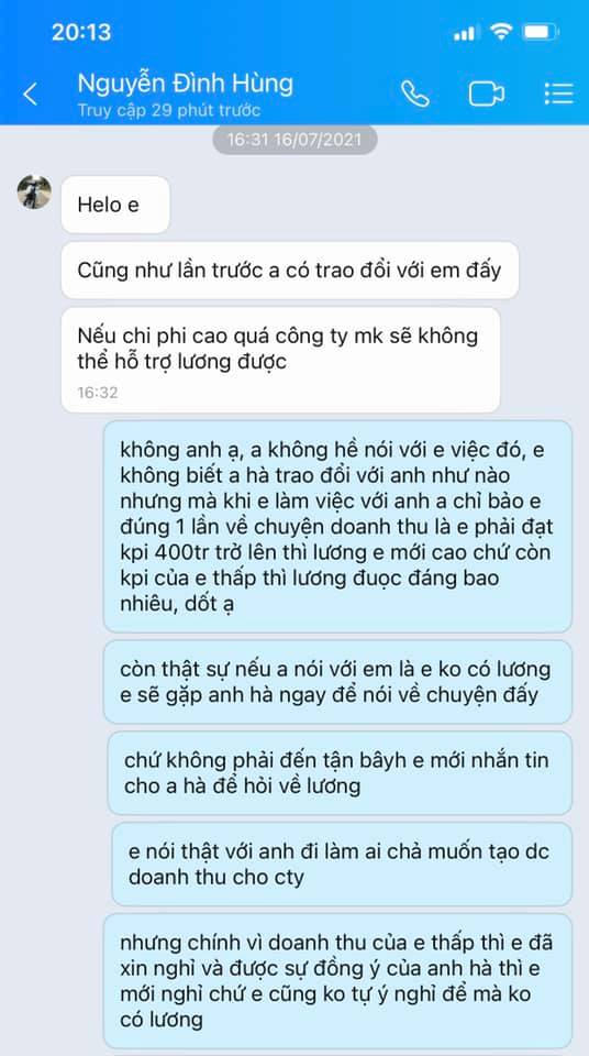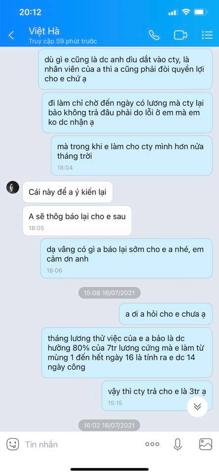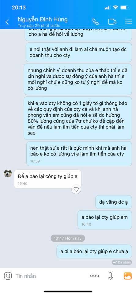 Nhưng h mình cần 1 lí do vì sao ko có lương thì lại 1 câu do nội quy cty 2 câu do nội quy cty :))) Đến lúc không nói lại dc mình thì giả vờ bảo để anh ý kiến lại với cty rồi nhắn em sau. Nhưng tất cả chỉ là lời nói dối thôi các bạn, vì sợ mình nhắn tin làm phiền nhiều nên phải nói thế. Sau đó thì có bảo mình trao đổi với anh làm cùng thì mình cũng đã nói thẳng luôn với anh làm cùng là mình chưa hề 1 lần nào nghe anh ý nói như vậy. Nhưng các bạn ạ nói chuyện với 2 anh thì cả 2 anh cho leo cây :)))