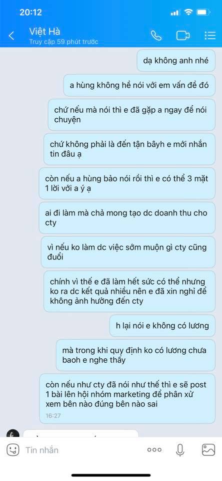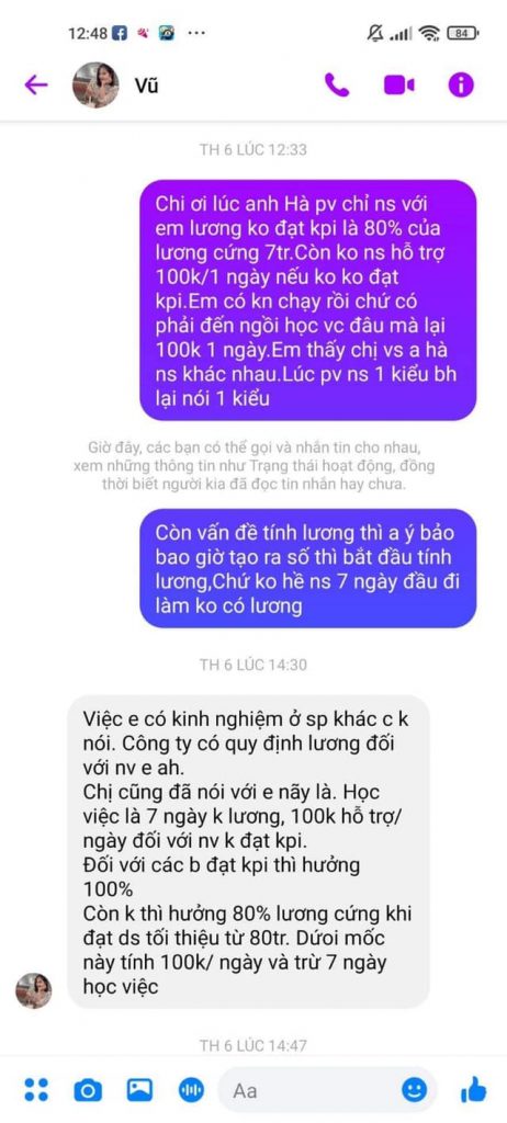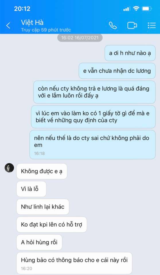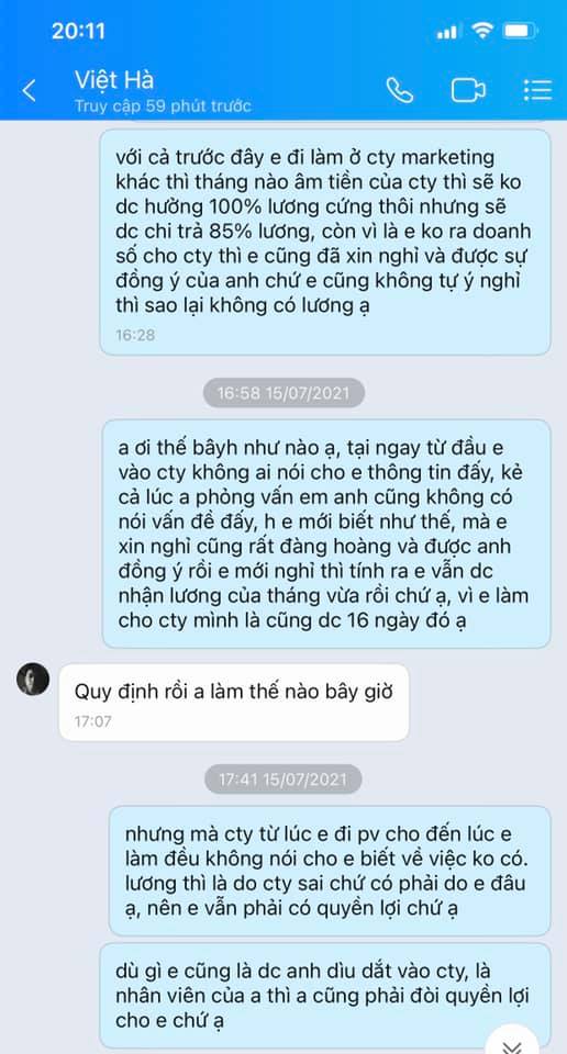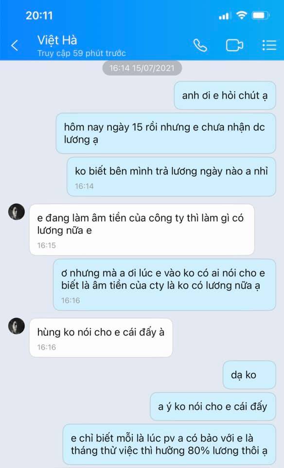 Mọi chuyện sẽ chẳng có gì cho đến hôm 15/7 vừa rồi mình có nhắn tin cho anh trưởng nhóm hỏi về vấn đề lương. Vì cty cũ mình ngày 15 hàng tháng là ngày trả lương, nhưng các bạn ạ câu trả lời mà a trưởng nhóm nói với mình đó là ” Em ơi em làm âm tiền của cty thì làm gì có lương”. Lúc đấy mình cảm thấy hơi có 1 sự hãm ở đây rồi. Và mình trả lời là ” Anh ơi lúc em vào làm ko có ai nói cho e quy định đó ạ” . Thì anh ý lại đùn đẩy trách nhiệm cho 1 người khác trong khi chính anh ý là người phỏng vấn với mình. Khi mình đi phỏng vấn a trưởng phòng chỉ nói với mình rằng tháng thử việc e sẽ được hưởng 80% lương cứng, chứ không hề đả động gì đến việc nếu làm âm tiền của cty thì sẽ như nào . Mà mình nói thật nếu mà cty nói ra chuyện đấy thì ai dám làm nữa nên phải giấu chứ sao dám nói :)))