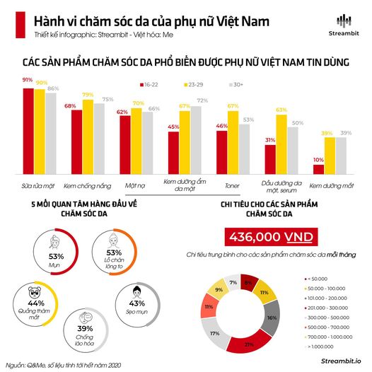 Tính ra chi phí chăm sóc da của các chị em cũng tốn kha khá nhỉ. Trung bình các chị e bỏ ra gần (500k/tháng) cho các sản phẩm chăm sóc da, chưa tính tới mỹ phẩm làm đẹp thì còn tốn thêm một mớ nữa. Trong đó chi tiêu phổ biến nhất cho sản phẩm chăm sóc da là vào khoảng (200k/tháng tới 300k/tháng). Chỉ có khoảng 7% chơi sang với mức chi tiêu lên tới 1 củ. ?