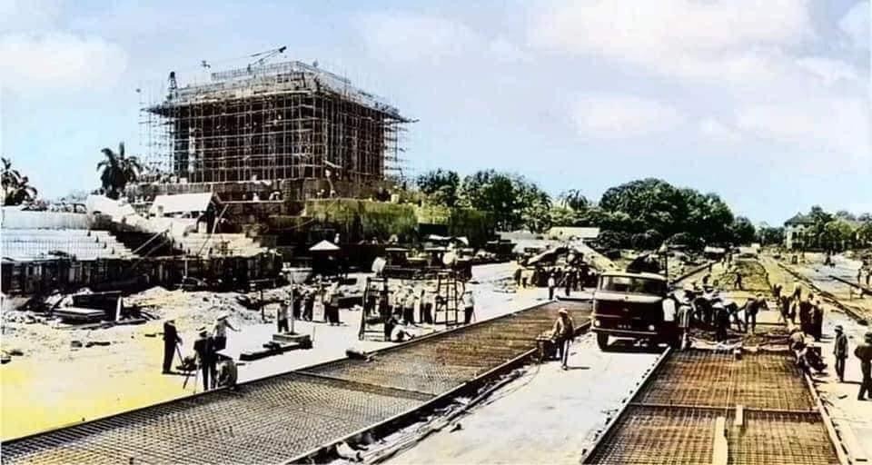 Lăng được xây dựng trên nền cũ của tòa lễ đài giữa Quảng trường Ba Đình, nơi Bác Hồ từng chủ trì các cuộc mít tinh lớn và đọc bản Tuyên ngôn Độc lập khai sinh ra nước Việt Nam Dân chủ Cộng hoà. Cùng với việc xây dựng Lăng, khu vực quảng trường cũng được thiết kế, cải tạo và xây dựng lại với tổng diện tích 14 ha. Trong ảnh: Công nhân đội thi công cơ giới Bộ Giao thông Vận tải san lấp mặt bằng xây dựng quảng trường trước Lăng.
