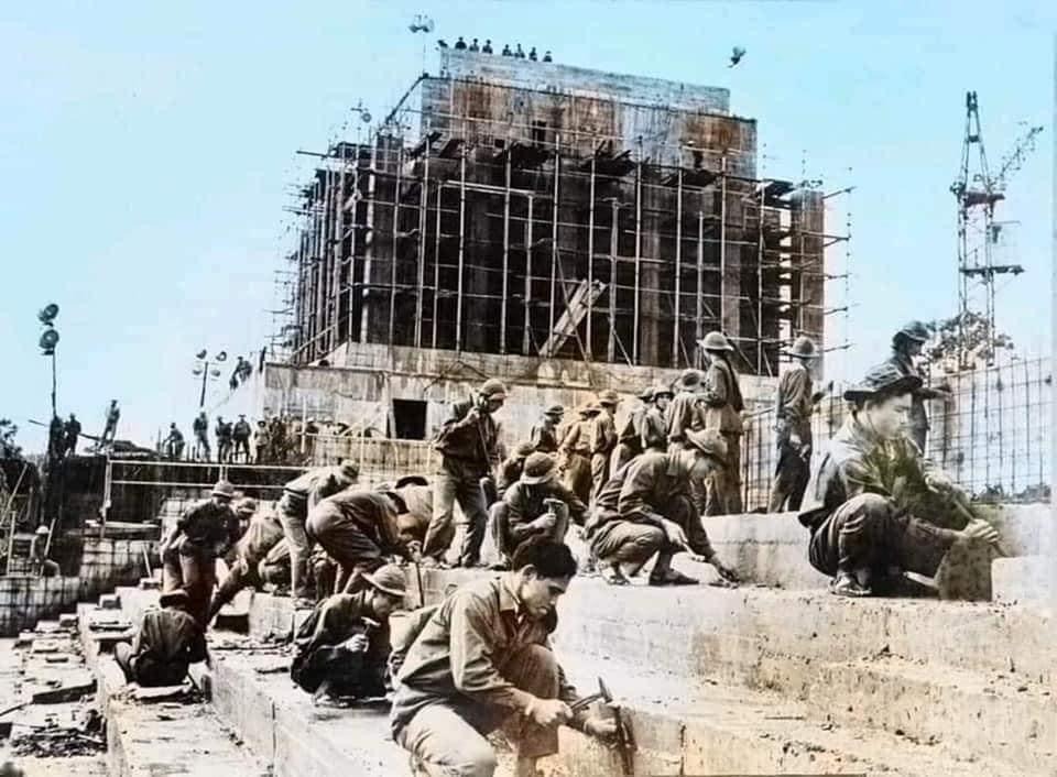 Lăng Chủ tịch Hồ Chí Minh được xây dựng theo 4 phương châm: Dân tộc, hiện đại, trang nghiêm, giản dị. Cấu trúc Lăng được chia làm 3 phần: Phần nền xây kiểu bệ tam cấp theo phong cách cổ truyền của kiến trúc Việt Nam; phần thân Lăng cả 4 mặt đều có cột để tạo ra các khoảng trống tựa như các gian của những ngôi nhà 5 gian ở các miền quê Việt Nam; phần mái Lăng hình vát giật tam giác gợi lên nét kiến trúc cổ kính đình chùa. Trong ảnh: Đoàn đại biểu anh hùng, dũng sĩ quân giải phóng miền Nam tham gia xây dựng Lăng Chủ tịch Hồ Chí Minh.