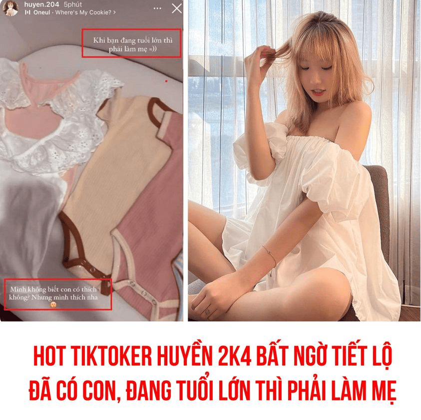 Mới đây, hot TikToker Huyền 2k4 bất ngờ đăng tải story với các bộ quần áo cho em bé. Đáng chú ý chính là những chia sẻ của cô nàng: “Khi bạn đang tuổi lớn đã phải làm mẹ” và “Mình không biết con mình có thích hay không? Nhưng mình thì thích nha”.