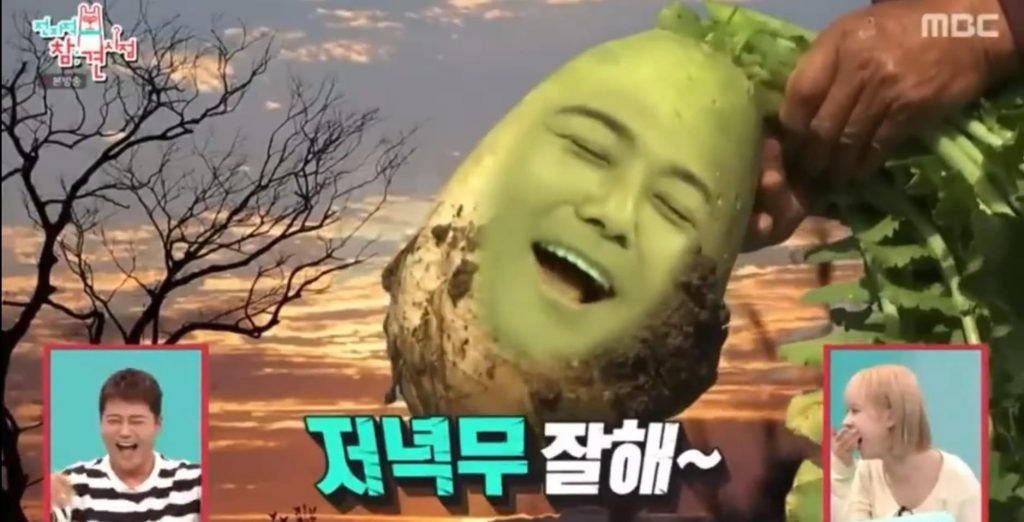 Vì là thành viên người ngoại quốc nên Giselle đã không nghe rõ tên Jun Hyun Moo mà tưởng là “Jeo Nyeok Moo” – củ cải cho bữa tối (*moo có nghĩa là “củ cải” trong tiếng Hàn). Chính MC Jun Hyun Moo cũng bật cười trước sự nhầm lẫn đáng yêu này của Giselle.