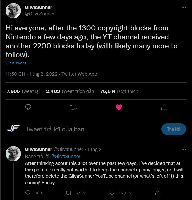 Thời gian gần đây, GilvaSunner đã vào danh sách đen của Nintendo. Kết quả là khoảng 1300 video của kênh đã bị gỡ vì lý do bản quyền. Thậm chí trong tweet gần đây, họ đã xác nhận con số này đã tăng thêm 2200 video.