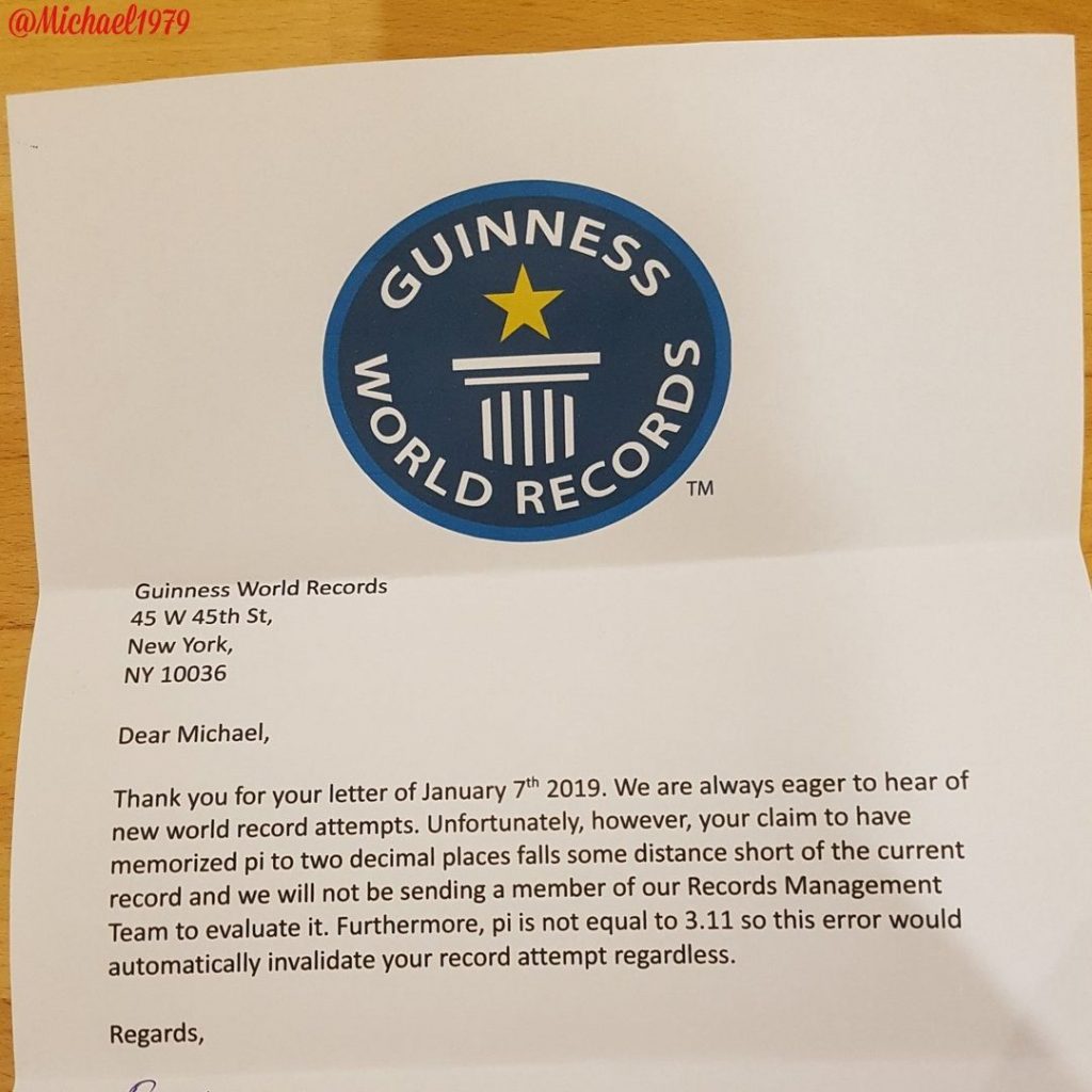 Tuy nhiên không phải ai cũng có được may mắn đấy. Vào năm 2019, một tài khoản Twitter tên @Michael1979 đã nộp hồ sơ để lập kỉ lục cho một việc khá đơn giản, đó là ghi nhớ 2 chữ số sau dấu phẩy của số Pi.