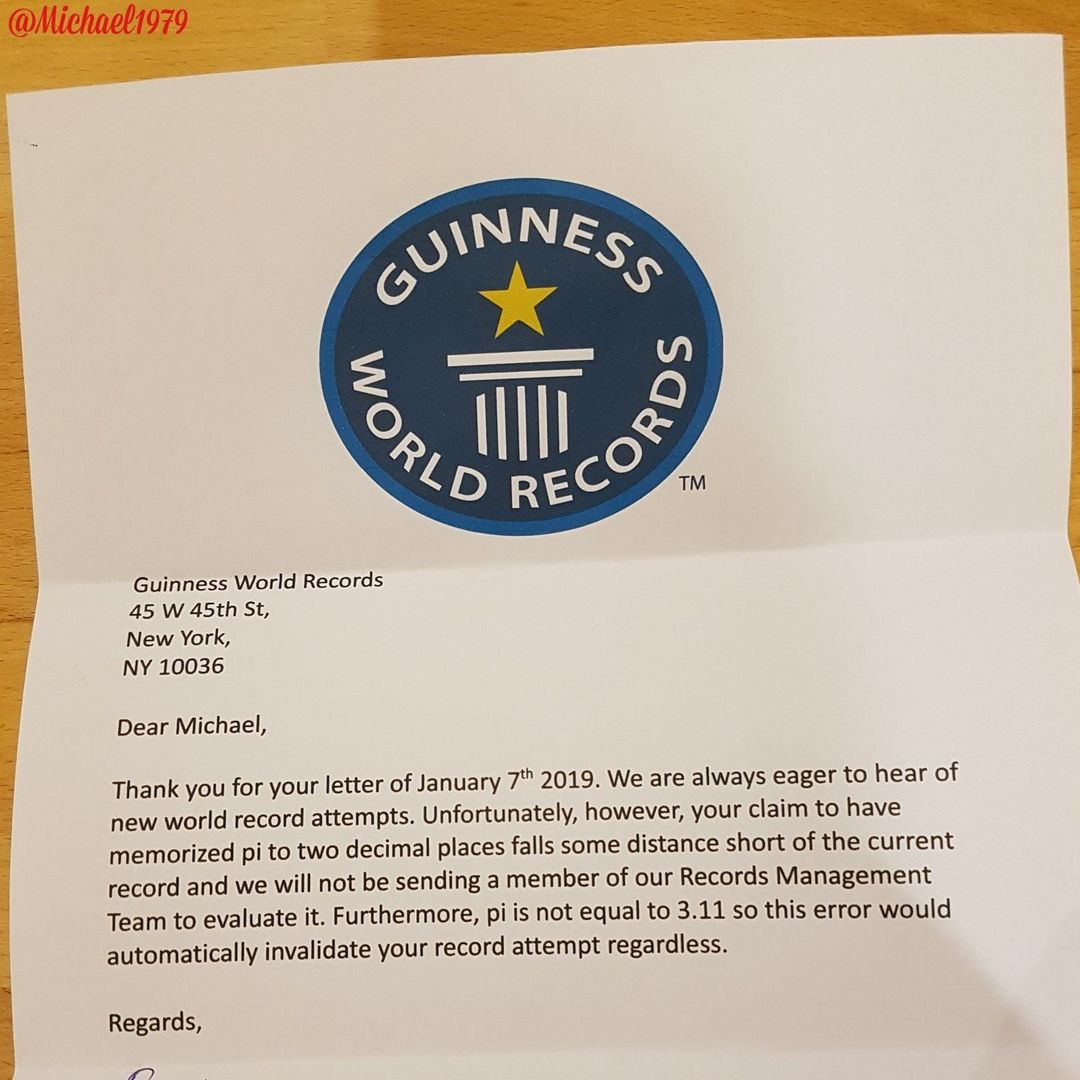 Chúng tôi luôn háo hức được biết về những nỗ lực lập kỷ lục thế giới mới. Thật không may, khả năng của bạn về việc ghi nhớ hai chữ số thập phân của số Pi thấp hơn khá nhiều so với kỷ lục hiện tại. Vì thế, đội thẩm định của chúng tôi quyết định không công nhận yêu cầu này.