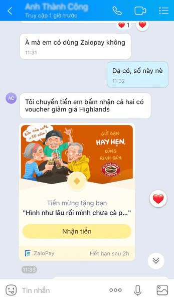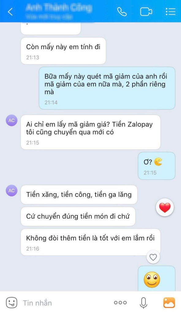Xong tui không chịu cái đòi chia tiền ăn uống bữa giờ. Mà tui thấy hài nhất là cái khúc mã giảm giá của ZaloPay. Vì ZaloPay đang có khuyến mãi, chuyển 1k với thiệp cho bạn bè nhận là cả 2 sẽ được voucher giảm giá, nên là mấy bữa đi ăn uống tụi tui có dùng mã.
