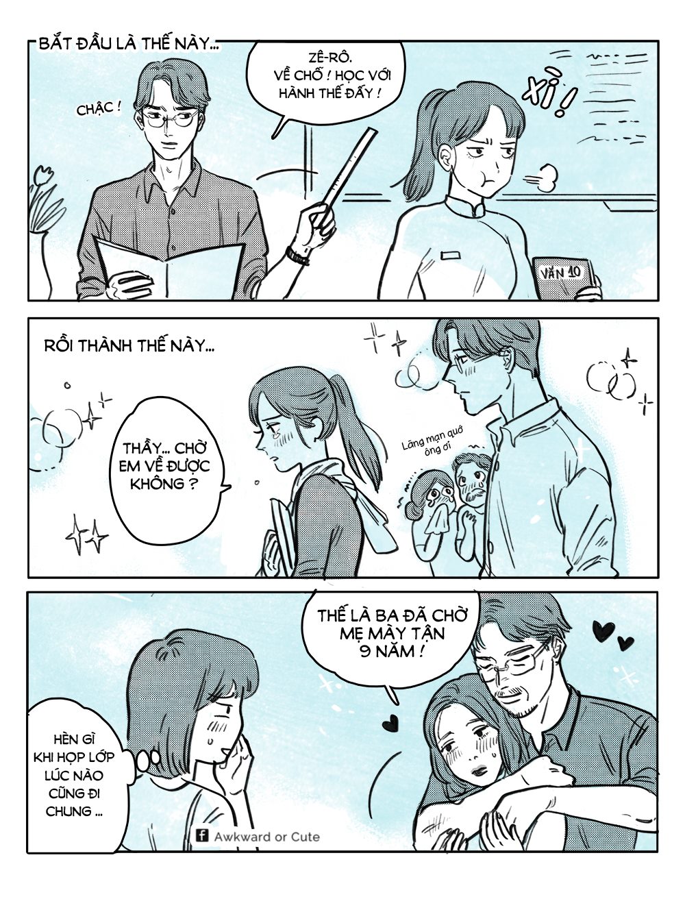 ) vì ngay lần đầu nhận lớp ba tao đã gọi mẹ tao dò bài, kết quả mẹ bị con zero :))). Từ đó, mỗi lần tới tiết ba tao thì mẹ tao để mặt lạnh lùng như diana cool fresh, trong giờ văn lấy vở toán ra làm, kết quả bị ”thầy” thu. Rồi sau vài lần ”gây gỗ”, mẹ tao quyết không đội trời chung với ông thầy. Sau đó thì ba tao về lại trường đại học để lấy bằng. Không biết có phải duyên số hay không nhưng năm mẹ tao lên 12 thì ba lại chuyển về trường mẹ, lại là giáo viên chủ nhiệm chính thức thay cho cô giáo cũ đã về hưu. Sau đó thì hình như hai người bắt đầu có thiện cảm với nhau hơn, 08.03 năm đó, ba còn tặng riêng mẹ tao tập thơ ba tự viết.