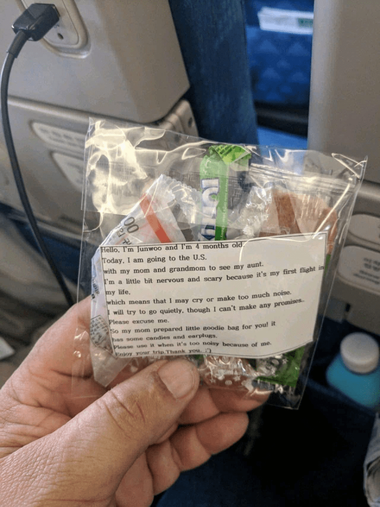 Túi đựng kẹo, bánh và cắm tai như một lời xin lỗi trước, trong trường hợp bé 4 tháng tuổi của bạn hét lên trên chuyến bay.