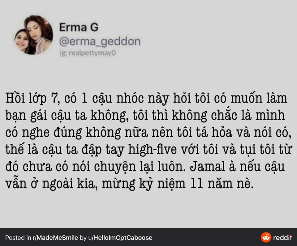 “Bạn trai” đầu tiên của tôi tên là Josh. Cậu ấy gửi cho tôi 1 tờ giấy ghi “có hoặc không”. Vài tuần sau, cậu ta hun tui (hun chớm chớm ý mà, tụi này mới học lớp 4 thôi) và chúng tui sau đó không thể tách rời ở trường á. Nhưng rồi cậu ấy chuyển đi. Đầu những năm 90 không internet để có thể theo dõi người ta đâu ý, nên tôi không nghe tin gì từ cậu ta nữa. Tôi thực lòng hy vọng câu ta đang sống tốt