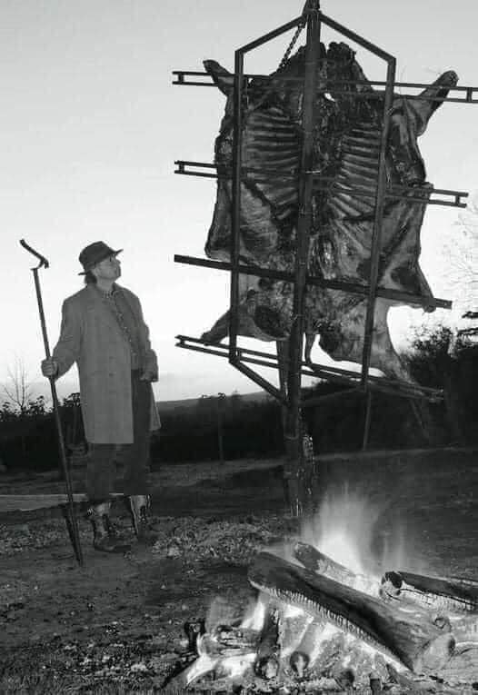 Người đàn ông giết thịt một con bò lớn, đốt lửa nướng và nói với con trai của mình.