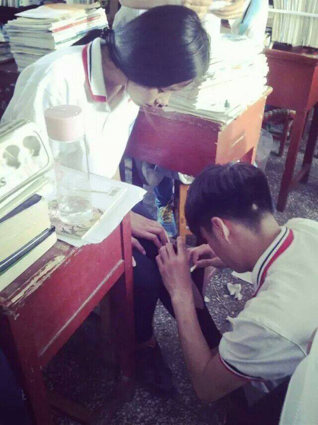 Một bạn nam trong lớp xé to cái quần ở chỗ bị thương để tra thuốc cho tôi.