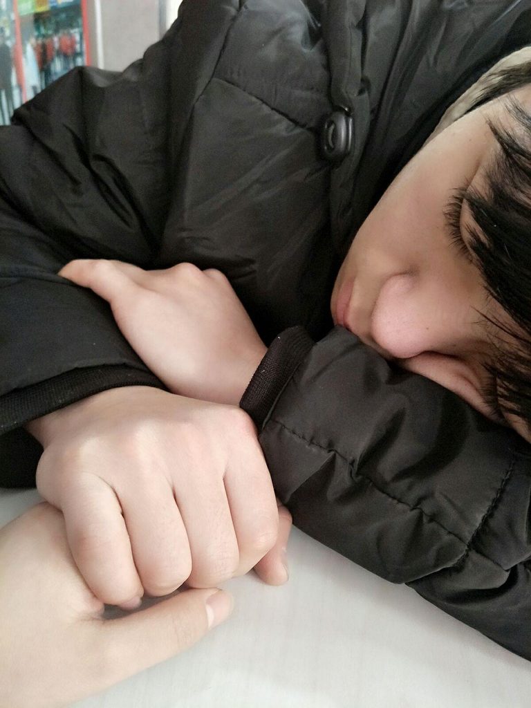 Còn tấm ảnh mà đến giờ tôi vẫn để trong máy là tấm này đây. Khi anh ấy đến đón tôi sau khi tôi tan làm, năm gục xuống dưới bàn trong khi tay cầm chặt tay tôi.