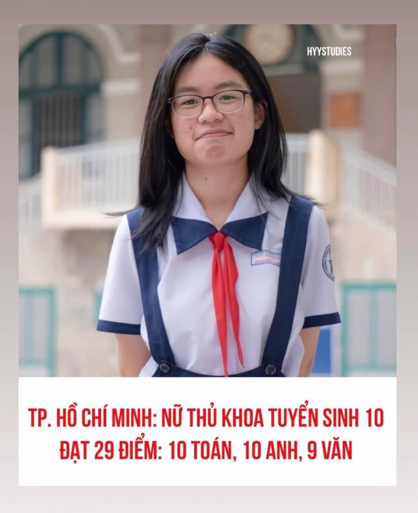 Trần Hồ An Nhiên – học sinh lớp 9A9 Trường THPT chuyên Trần Đại Nghĩa – là cô gái duy nhất trong ba thủ khoa kỳ thi tuyển sinh lớp 10 tại TP.HCM. An Nhiên đạt tổng cộng 29 điểm (văn 9, toán 10, tiếng Anh 10).