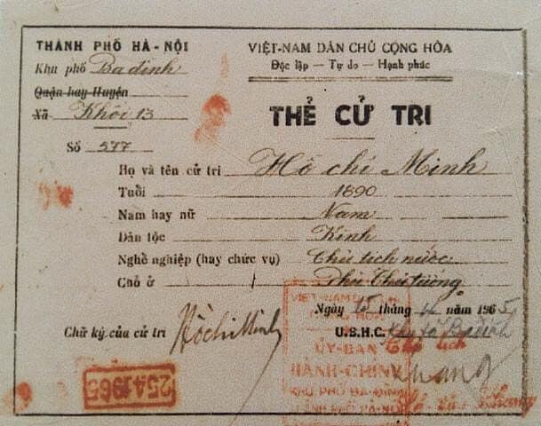 Tấm thẻ cử tri số 577, cấp ngày 15/4/1965 để bầu Hội đồng Nhân dân thành phố Hà Nội vào ngày 25/4/1965. Trên tấm thẻ cử tri này có hai điều đặc biệt, con dấu …