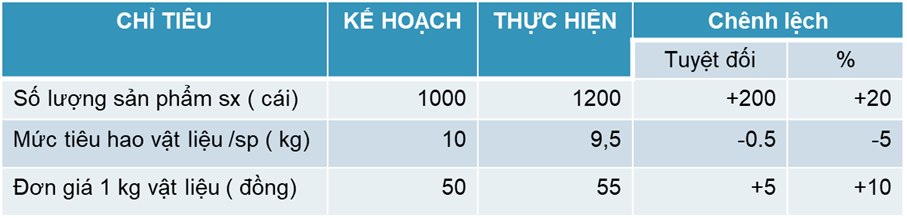 Trong bảng dưới đây, cho thấy theo kế hoạch Doanh nghiệp sẻ tiến hành sx 1000 sp, với mức tiêu hao 10kg nguyên vật liệu cho một sp. Tuy nhiên khi tiến hành DN đã thay đổi kế hoạch với chính sách mới dùng một loại nguyên vật liệu khác có mức tiêu hao 9,5 kg/sp và vì thế đả sx được 1200 sp nhưng với giá 55 đ thay vì chỉ 50 đ như kế hoạch củ.