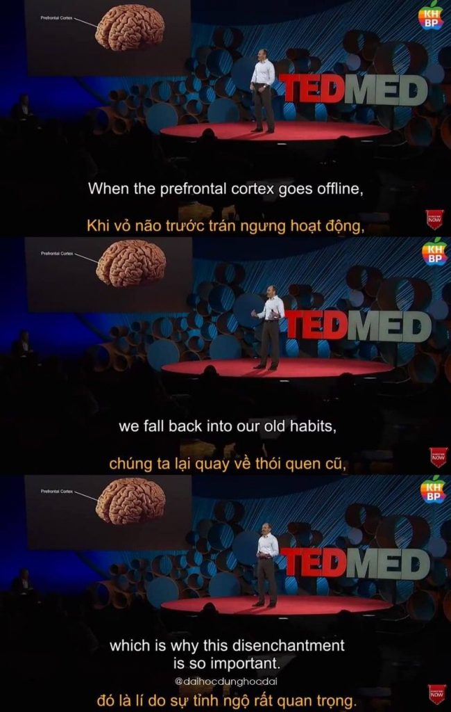 Judson Brewer cho biết thay vì chống lại bộ não hoặc cố ép buộc nó tập trung, chúng ta hãy tham giá quá trình dựa trên phần thưởng này để thay đổi thói quen xấu. Nhưng, hãy thêm một sự thay đổi nhỏ vào đó.