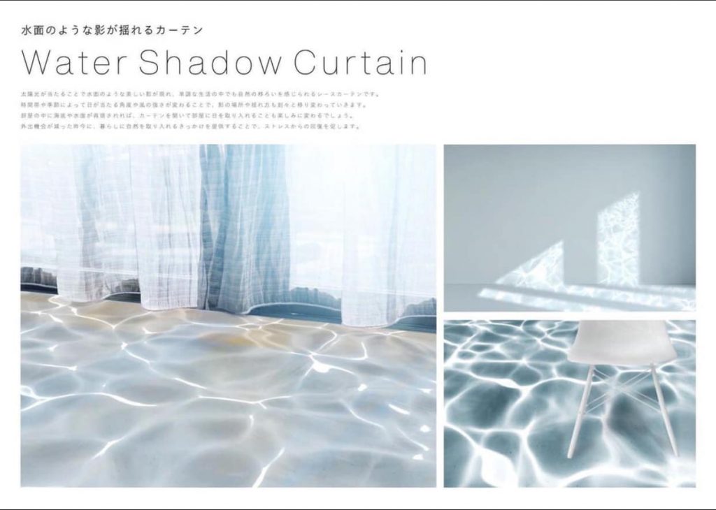 Tấm rèm đặc biệt được đặt tên là “Water Shadow Curtain”, làm từ chất liệu ren. Theo phần giới thiệu sản phẩm, nhà thiết kế người Nhật – Oto Kawamata đã mô tả rèm có tác dụng lọc ánh sáng để tạo ra hiện tượng tụ quang (caustic), là các dạng dao động ngẫu nhiên của các vạch sáng dưới đáy hồ bơi hoặc bể cá. Các tụ quang này được tạo ra do phản xạ và khúc xạ của ánh sáng mặt trời. Khi mặt trời di chuyển hoặc tấm rèm chuyển động, các vạch sáng sẽ chuyển động như dòng nước chảy nhẹ nhàng.