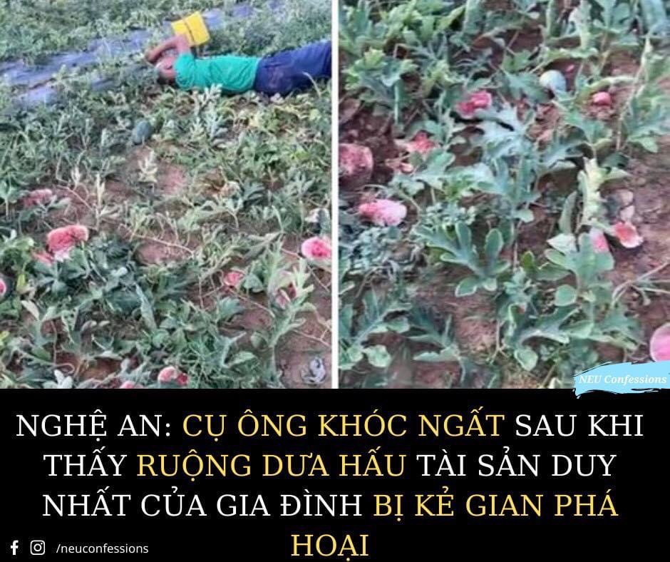 Được biết, hoàn cảnh của ông rất khó khăn. Ruộng dưa hấu này là tất cả tài sản của gia đình ông. Hai vợ chồng ông vất vả dầm mưa dãi nắng, cằm cụi làm suốt 3 tháng nay chuẩn bị thu hoạch thì xảy ra sự việc trên.