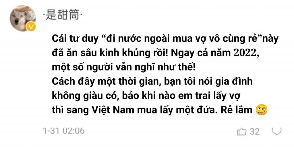 2. Cái tư duy “đi nước ngoài mua vợ vô cùng rẻ” này đã ăn sâu kinh khủng rồi! Ngay cả năm 2022, một số người vẫn nghĩ như thế!  Cách đây một thời gian, bạn tôi nói gia đình không giàu có, bảo khi nào em trai lấy vợ thì sang Việt Nam mua một đứa. Rẻ lắm!!!