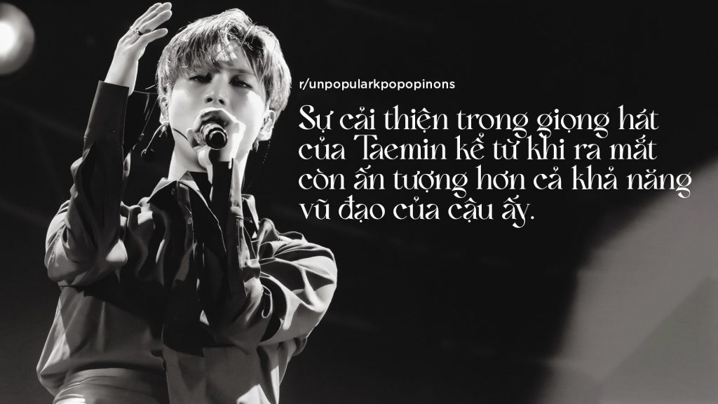 Ồ, cái này thú vị phết này. Tôi cho rằng điều này là không phổ biến vì mọi người dường như hay nhấn mạnh vào khả năng vũ đạo của cậu ấy. Tuy nhiên, tôi đồng ý với bồ ở một mức độ nào đó. Một trong những khía cạnh mà mọi người thường bỏ qua trong cuộc tranh luận xem ai là “dancer giỏi nhất” đó là khả năng trình diễn nói chung, và ca hát cũng là một phần trong đó. Về mặt đó, những “dancer giỏi nhất” khác thường không thể sánh ngang được với khả năng thanh nhạc của Taemin. Chính điều ấy khiến cậu ấy khác biệt. Cậu ấy là nghệ sĩ biểu diễn toàn năng.